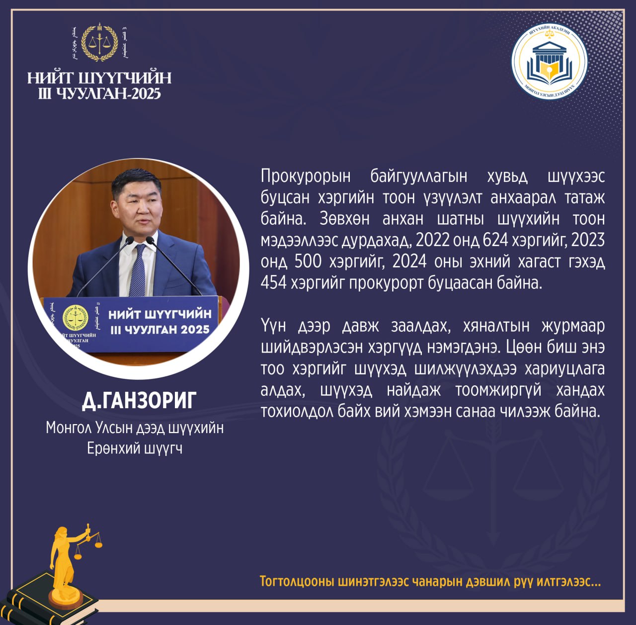 Монгол Улсын дээд шүүхийн Ерөнхий шүүгч Д.Ганзориг "ТОГТОЛЦООНЫ ШИНЭТГЭЛЭЭС ЧАНАРЫН ДЭВШИЛ РҮҮ" сэдэвт илтгэээс ...