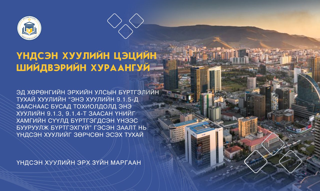 ЭД ХӨРӨНГИЙН ЭРХИЙН УЛСЫН БҮРТГЭЛИЙН ТУХАЙ ХУУЛИЙН “ЭНЭ ХУУЛИЙН 9.1.5-Д ЗААСНААС БУСАД ТОХИОЛДОЛД ЭНЭ ХУУЛИЙН 9.1.3, 9.1.4-Т ЗААСАН ҮНИЙГ ХАМГИЙН СҮҮЛД БҮРТГЭГДСЭН ҮНЭЭС БУУРУУЛЖ БҮРТГЭХГҮЙ” ГЭСЭН ЗААЛТ НЬ ҮНДСЭН ХУУЛИЙГ ЗӨРЧСӨН ЭСЭХ ТУХАЙ