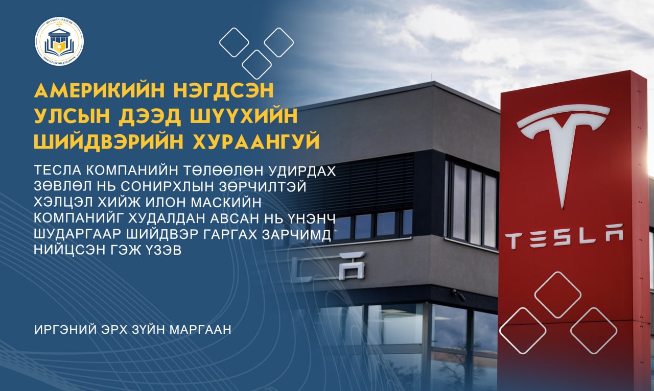 ТЕСЛА КОМПАНИЙН ТӨЛӨӨЛӨН УДИРДАХ ЗӨВЛӨЛ НЬ СОНИРХЛЫН ЗӨРЧИЛТЭЙ ХЭЛЦЭЛ ХИЙЖ ИЛОН МАСКИЙН КОМПАНИЙГ ХУДАЛДАН АВСАН НЬ ҮНЭНЧ ШУДАРГААР ШИЙДВЭР ГАРГАХ ЗАРЧИМД НИЙЦСЭН ГЭЖ ҮЗЭВ
