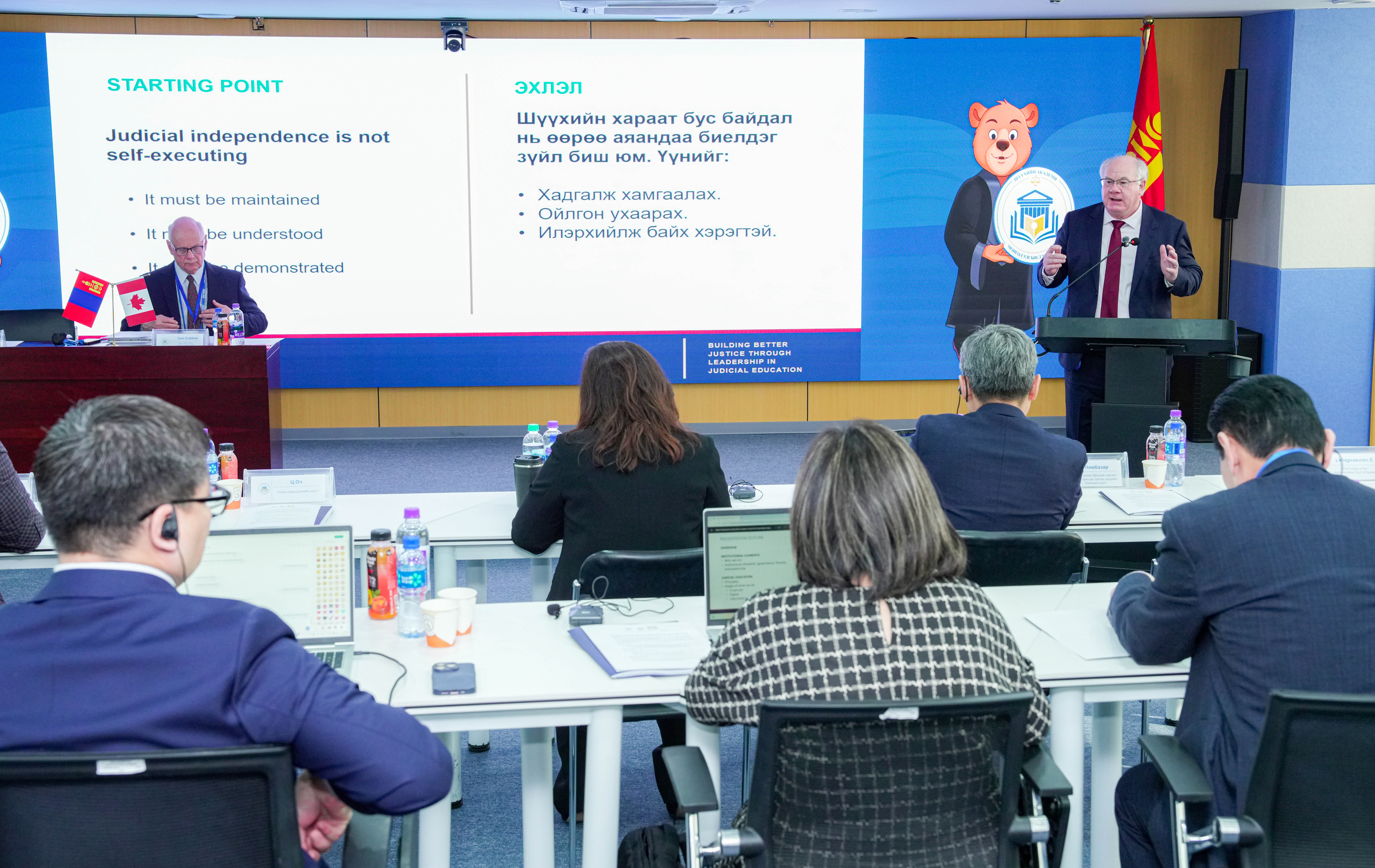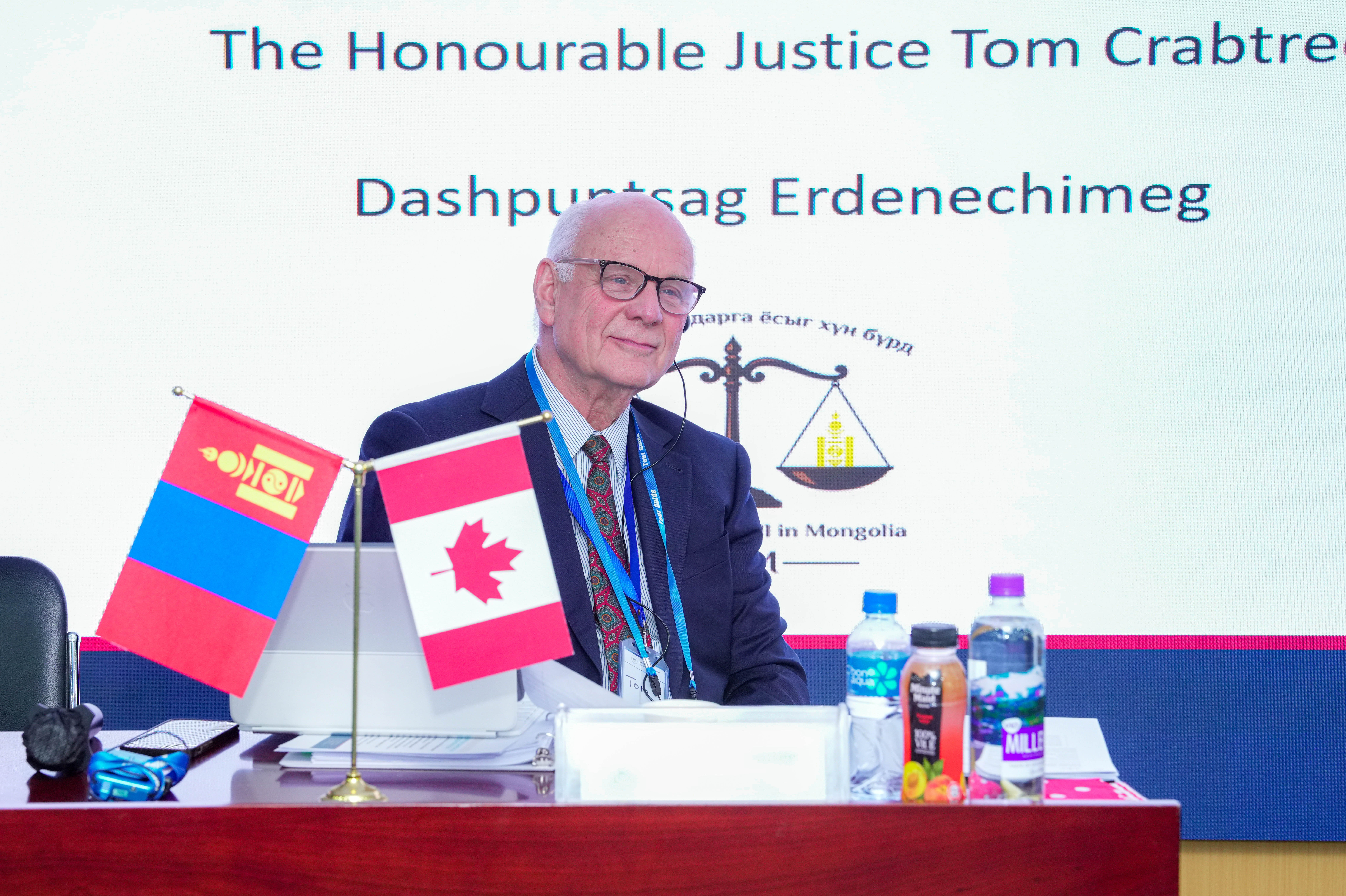 Үргэлжлүүлэн Канад Улсын Бритиш Колумбиа мужийн Дээд шүүхийн шүүгч, Шүүхийн үндэсний хүрээлэнгийн Шүүхийн сургалтын тэргүүн Том Крабтри: “Шүүх засаглалд итгэх олон нийтийн итгэлийг нэмэгдүүлэх нь нэн чухал асуудал. Бид энэхүү итгэлийг бэхжүүлэхийн тулд шүүхийн боловсролоор дамжуулан шүүгчдийн мэдлэг, чадварыг тасралтгүй чадавхжуулахыг нэн тэргүүнд чухалчилж байна. Энэхүү хоёр өдрийн сургалт нь зөвхөн хичээл заах бус, талууд харилцан санал бодлоо солилцсон, идэвхтэй оролцоонд суурилсан арга хэмжээ болно гэдэгт итгэлтэй байна. Бидний зүгээс Монгол Улсын шүүгчдийн өнөөгийн нөхцөл байдал, хэрэгцээ шаардлагыг судалж, харилцан нэгнээсээ суралцах өргөн боломж байна” гэв.