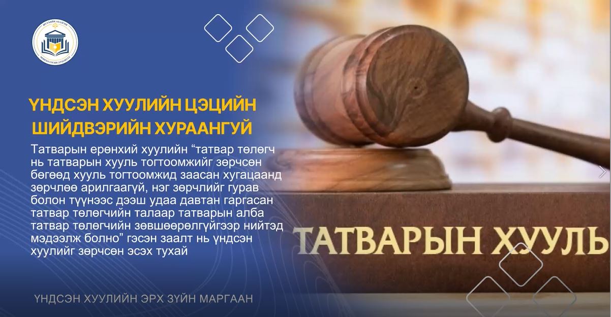 ТАТВАРЫН ЕРӨНХИЙ ХУУЛИЙН “ТАТВАР ТӨЛӨГЧ НЬ ТАТВАРЫН ХУУЛЬ ТОГТООМЖИЙГ ЗӨРЧСӨН БӨГӨӨД ХУУЛЬ ТОГТООМЖИД ЗААСАН ХУГАЦААНД ЗӨРЧЛӨӨ АРИЛГААГҮЙ, НЭГ ЗӨРЧЛИЙГ ГУРАВ БОЛОН ТҮҮНЭЭС ДЭЭШ УДАА ДАВТАН ГАРГАСАН ТАТВАР ТӨЛӨГЧИЙН ТАЛААР ТАТВАРЫН АЛБА ТАТВАР ТӨЛӨГЧИЙН ЗӨВШӨӨРӨЛГҮЙГЭЭР НИЙТЭД МЭДЭЭЛЖ БОЛНО” ГЭСЭН ЗААЛТ НЬ ҮНДСЭН ХУУЛИЙГ ЗӨРЧСӨН ЭСЭХ ТУХАЙ