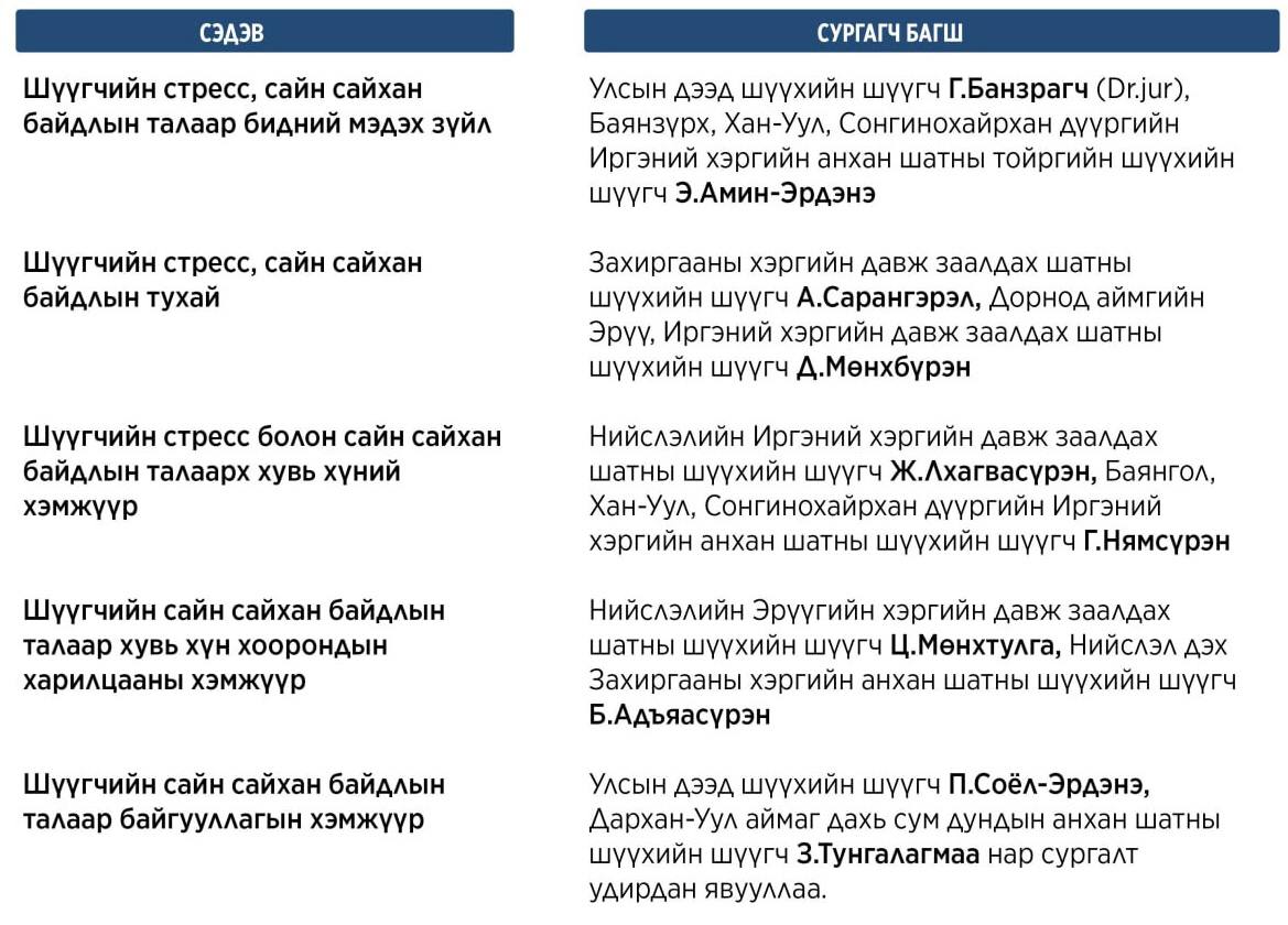 Мөн шүүгчийн стресс, сайн сайхан байдлын сэдвээр анх удаа сургалт явуулсан бөгөөд шүүгчдийн бие махбод, сэтгэл санааны эрүүл мэндийг дэмжих, стресс менежмент, сэтгэлзүйн тогтвортой байдлыг сайжруулахад чиглэснээрээ онцлог болж байна.