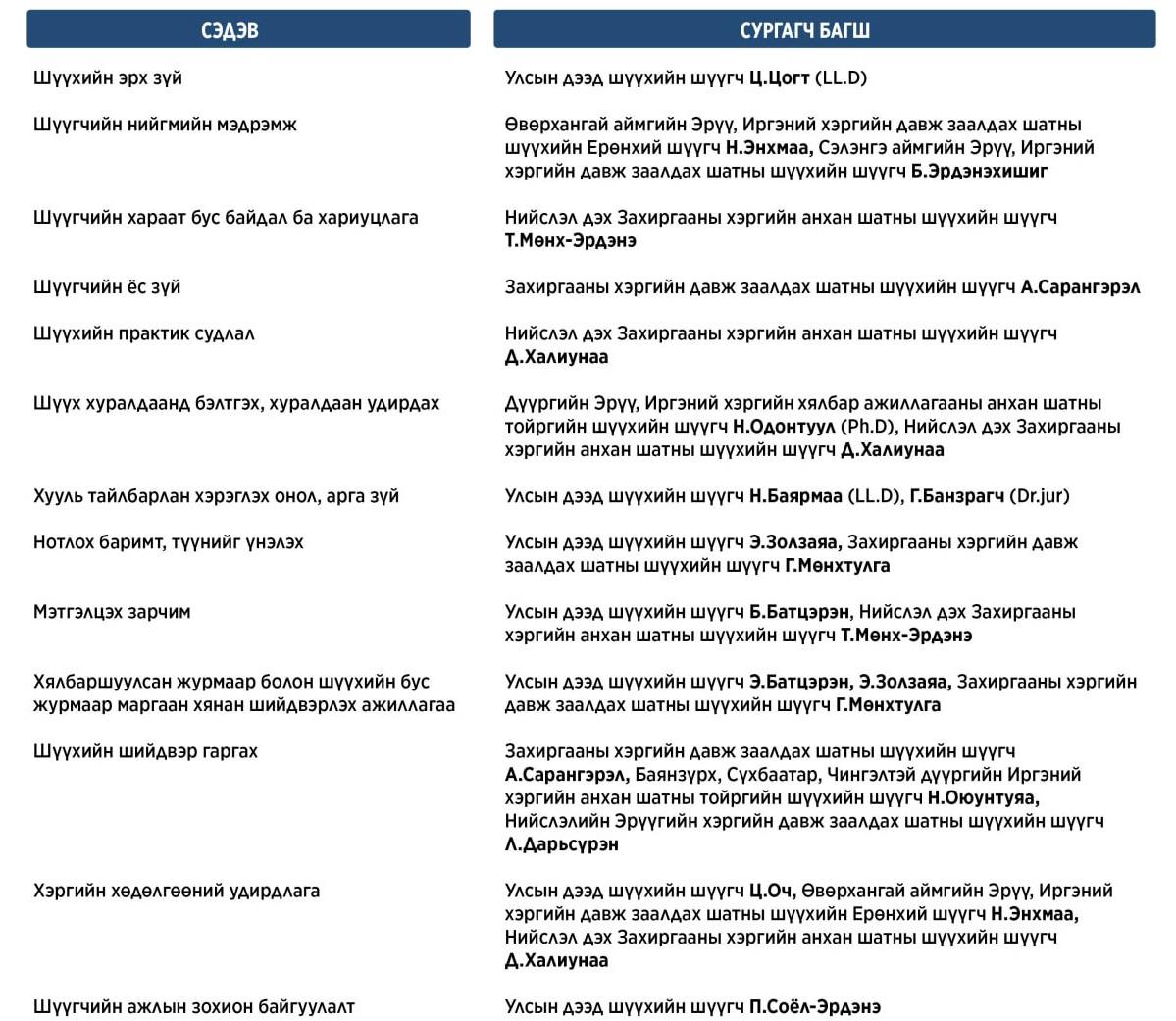 Сургалтыг шүүхийн эрх зүй, ёс зүй, хараат бус байдал, шүүх хуралдааны зохион байгуулалт зэрэг олон чухал сэдвүүдийн хүрээнд Улсын дээд шүүх, Давж заалдах шатны болон Анхан шатны шүүхийн шүүгчид удирдан явууллаа.
