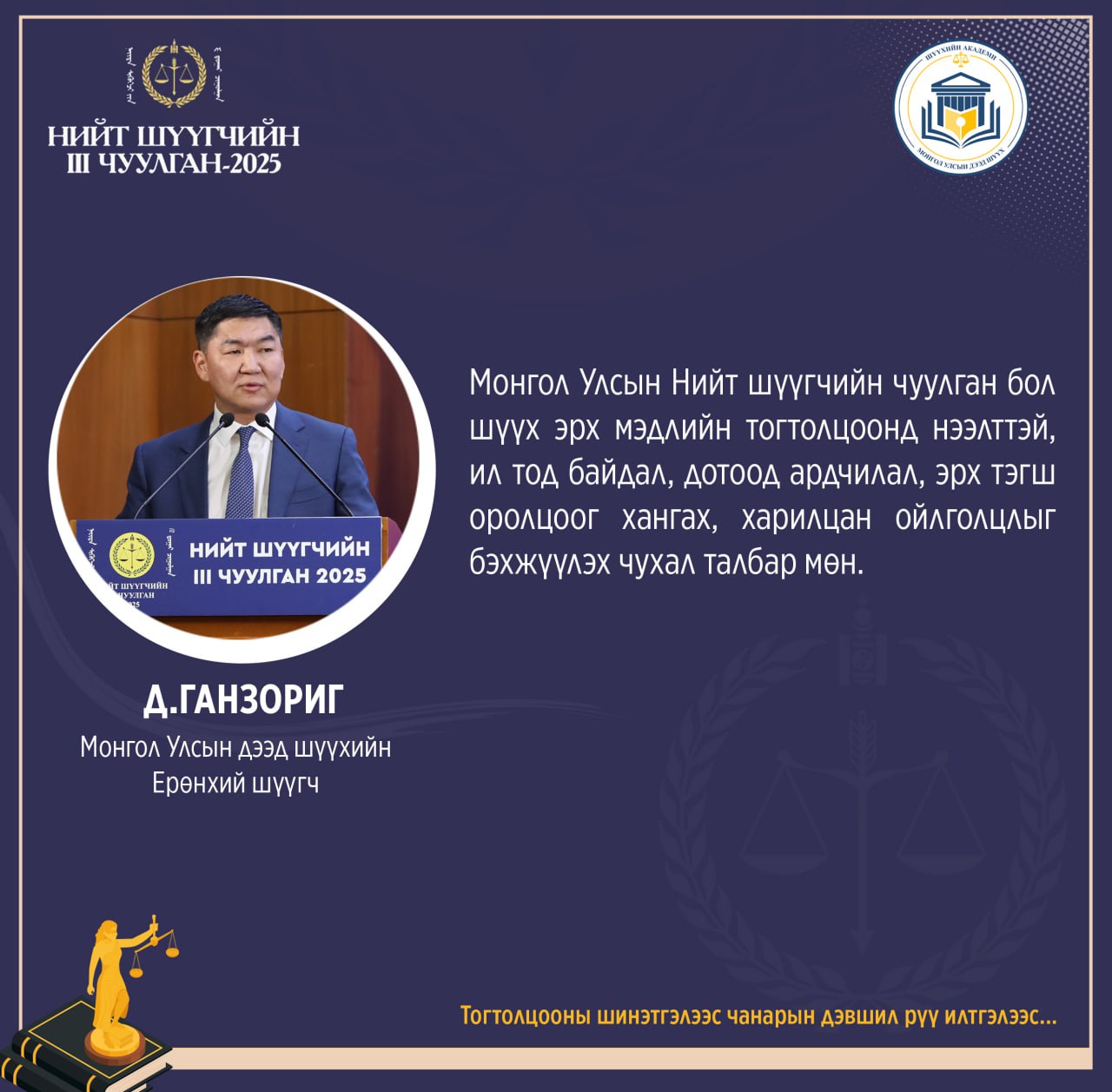 Монгол Улсын дээд шүүхийн Ерөнхий шүүгч Д.Ганзориг "ТОГТОЛЦООНЫ ШИНЭТГЭЛЭЭС ЧАНАРЫН ДЭВШИЛ РҮҮ" сэдэвт илтгэлээс ...