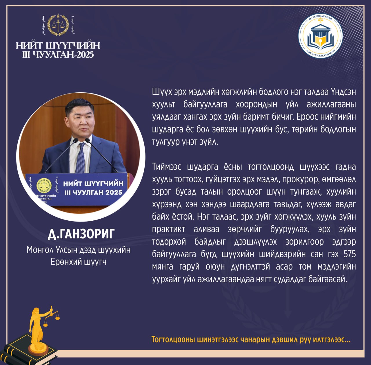 Монгол Улсын дээд шүүхийн Ерөнхий шүүгч Д.Ганзориг "ТОГТОЛЦООНЫ ШИНЭТГЭЛЭЭС ЧАНАРЫН ДЭВШИЛ РҮҮ" сэдэвт илтгэлээс ...