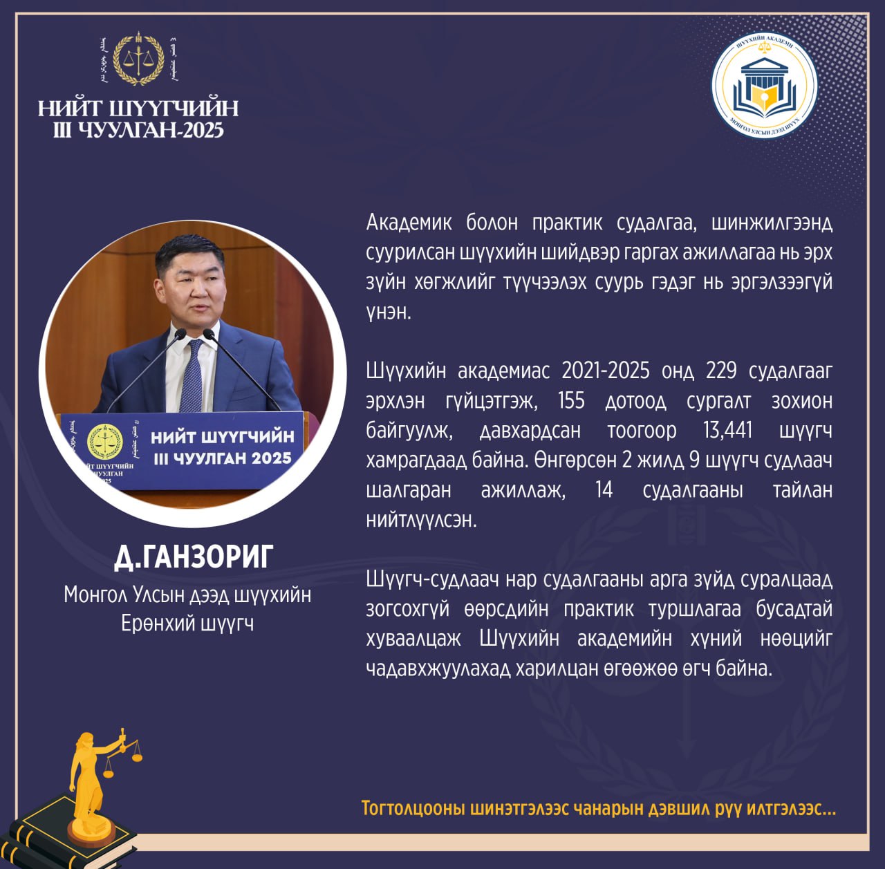Монгол Улсын дээд шүүхийн Ерөнхий шүүгч Д.Ганзориг "ТОГТОЛЦООНЫ ШИНЭТГЭЛЭЭС ЧАНАРЫН ДЭВШИЛ РҮҮ" сэдэвт илтгэлээс ...