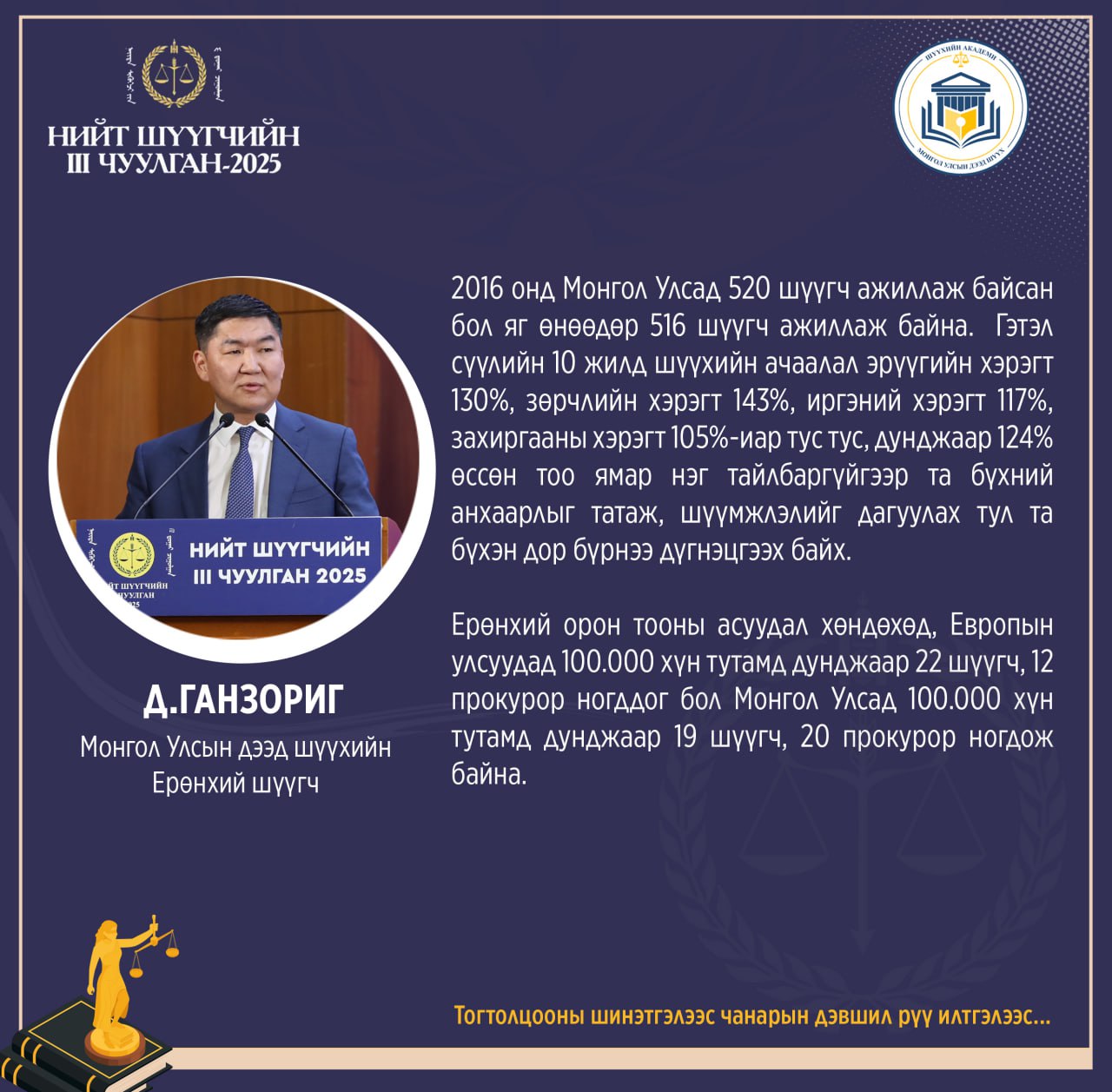 Монгол Улсын дээд шүүхийн Ерөнхий шүүгч Д.Ганзориг "ТОГТОЛЦООНЫ ШИНЭТГЭЛЭЭС ЧАНАРЫН ДЭВШИЛ РҮҮ" сэдэвт илтгэлээс ...