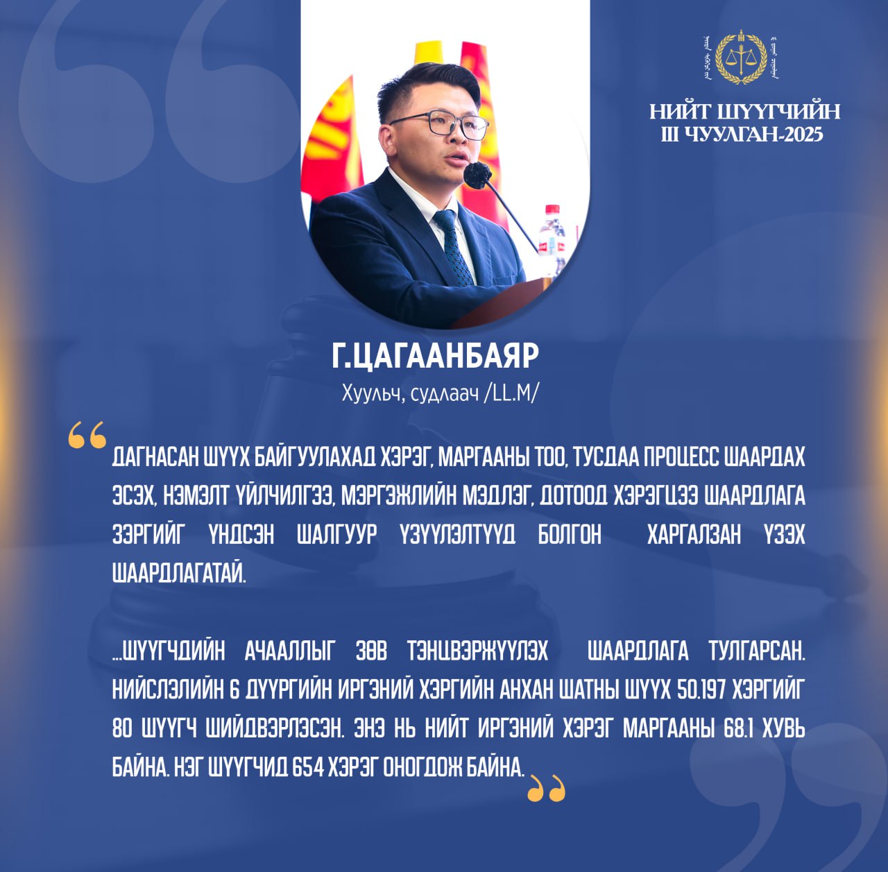 Хуульч, судлаач Г.Цагаанбаяр Нийт шүүгчийн III чуулганд хэлэлцүүлсэн "ШҮҮХИЙН ТОГТОЛЦОО, ЗОХИОН БАЙГУУЛАЛТЫГ БОЛОВСРОНГУЙ БОЛГОХ НЬ: ДАГНАСАН БОЛОН ТОЙРГИЙН ШҮҮХ" сэдэвт илтгэлээс ...
