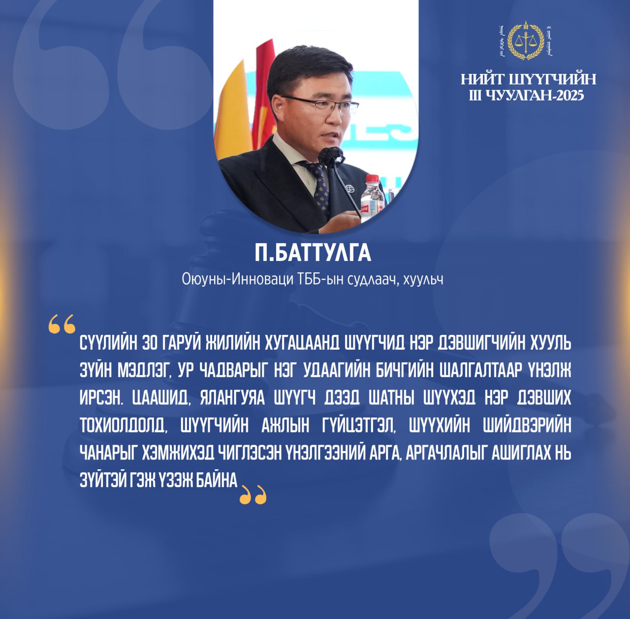Оюуны-Инноваци ТББ-ын судлаач, хуульч П.Баттулга Нийт шүүгчийн III чуулганд хэлэлцүүлсэн "ШҮҮГЧИЙН СОНГОН ШАЛГАРУУЛАЛТ: ХУУЛИЙН ХЭРЭГЖИЛТ, АНХААРАХ ЗАРИМ АСУУДАЛ " сэдэвт илтгэлээс ...