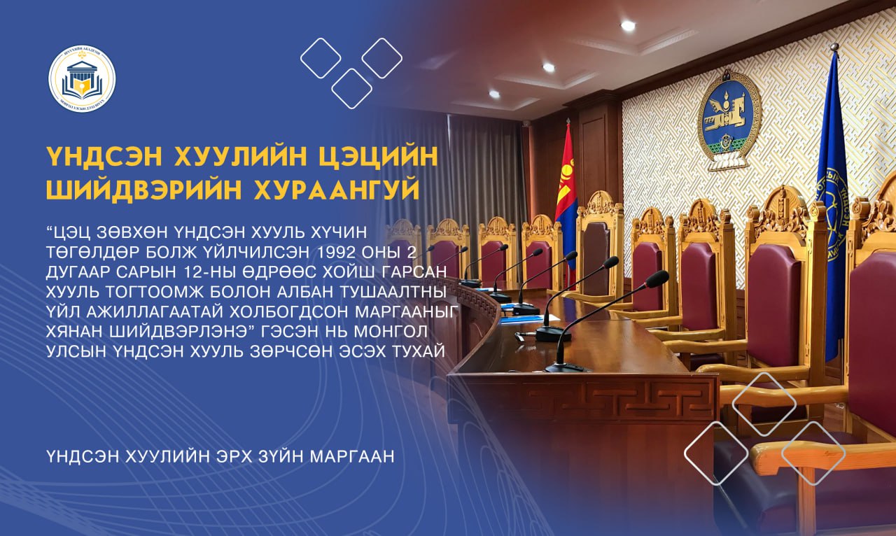 “ЦЭЦ ЗӨВХӨН ҮНДСЭН ХУУЛЬ ХҮЧИН ТӨГӨЛДӨР БОЛЖ ҮЙЛЧИЛСЭН 1992 ОНЫ 2 ДУГААР САРЫН 12-НЫ ӨДРӨӨС ХОЙШ ГАРСАН ХУУЛЬ ТОГТООМЖ БОЛОН АЛБАН ТУШААЛТНЫ ҮЙЛ АЖИЛЛАГААТАЙ ХОЛБОГДСОН МАРГААНЫГ ХЯНАН ШИЙДВЭРЛЭНЭ” ГЭСЭН НЬ МОНГОЛ УЛСЫН ҮНДСЭН ХУУЛЬ ЗӨРЧСӨН ЭСЭХ ТУХАЙ