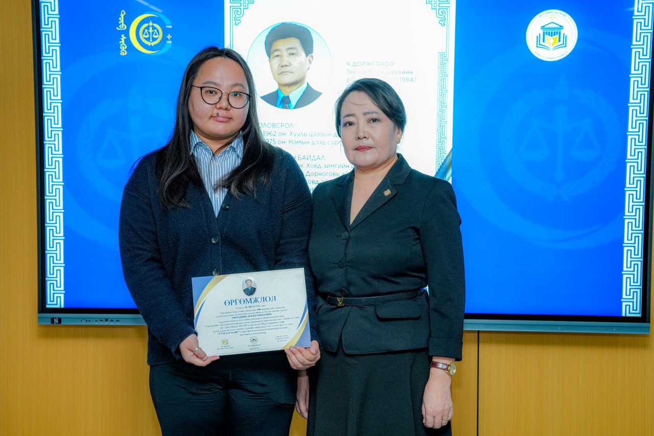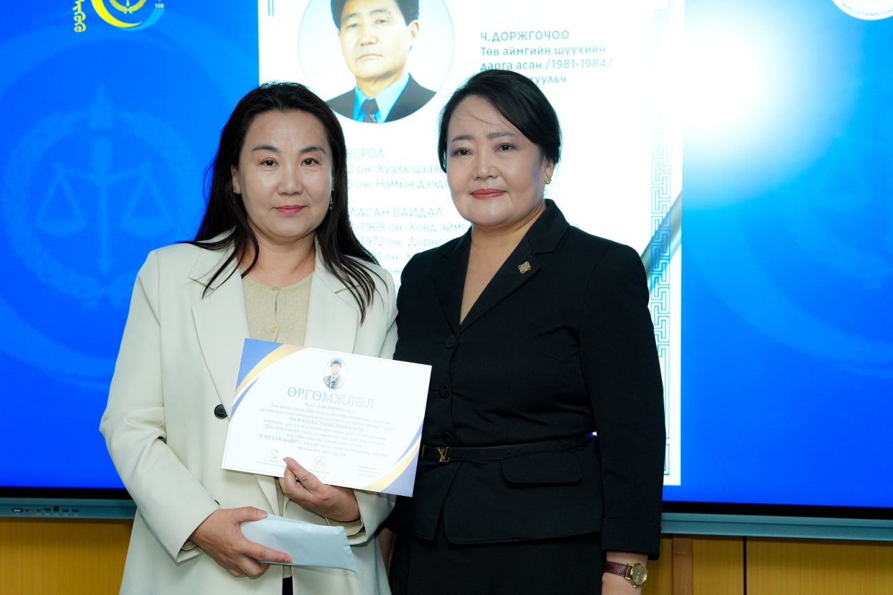 Төв аймагт шүүх байгуулагдсаны түүхт 100 жилийн ойг тохиолдуулан Монгол Улсын Гавьяат хуульч Ч.Доржгочоо, М.Могноон нарын нэрэмжит “Шилдэг илтгэл” шалгаруулах уралдааны шагнал гардуулах ёслол 2026 оны 3 дугаар сарын 27-ны өдөр зохион байгуулагдлаа.
